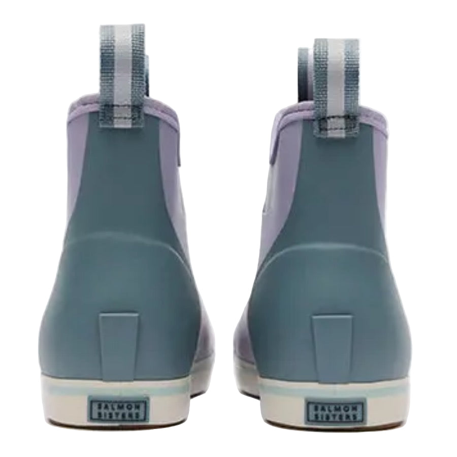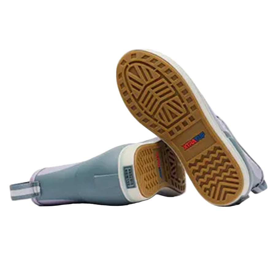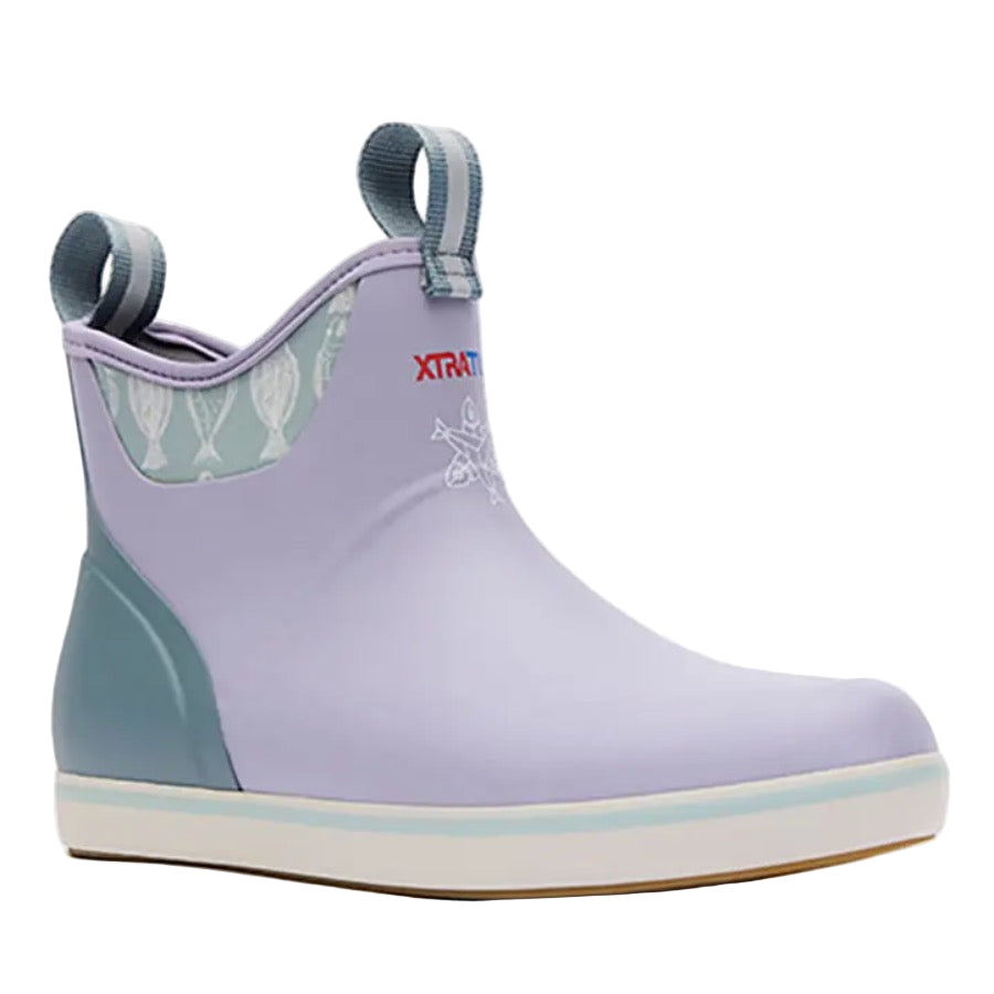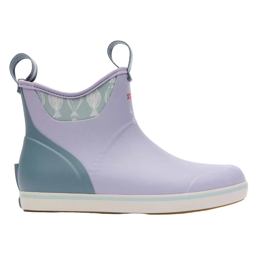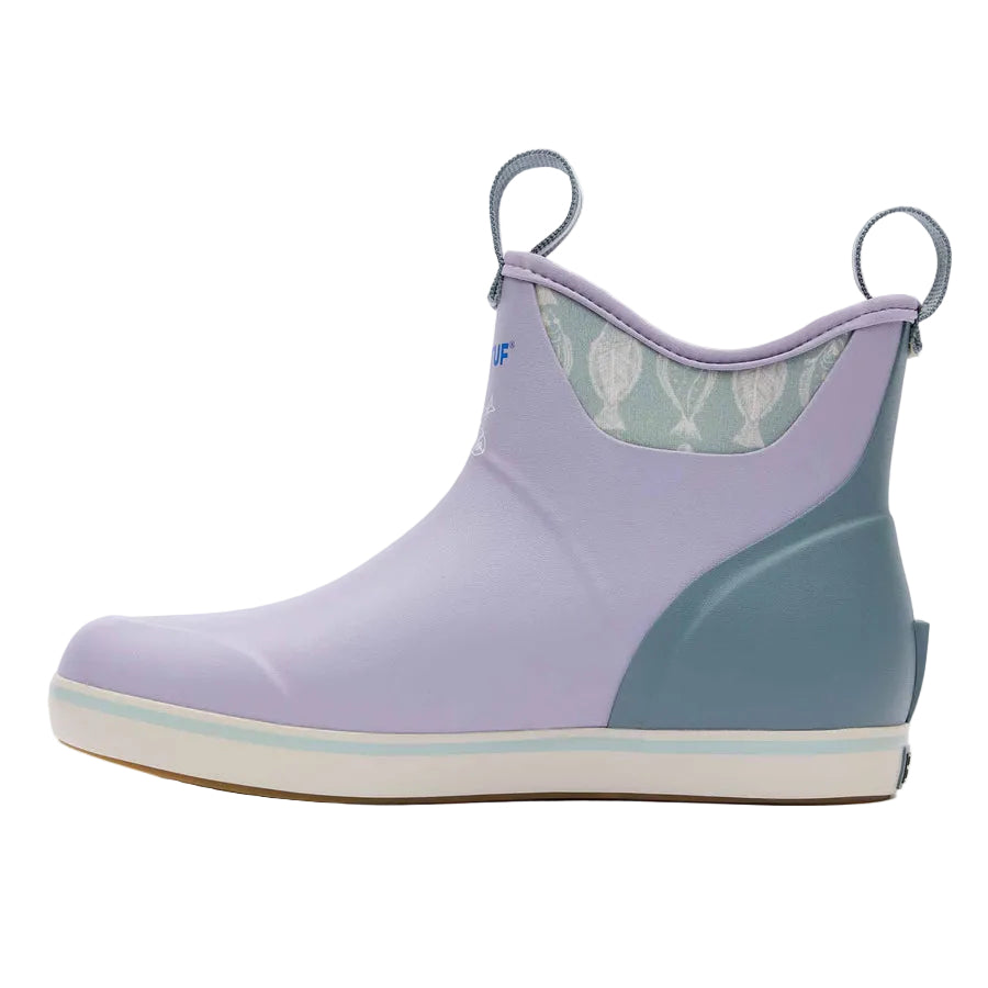 The Ankle Deck Boot collection has been crafted specifically for Off-Shore anglers. Anglers are athletes, and like any athlete they need the best footwear to help them perform at a high level. We've created a lightweight design with the same slip-resistant Chevron outsole found in our Legacy boots. The performance ankle deck boot is the perfect boot for any on the water athlete looking for protection with slip-on-and-go styling. This Lavender Gray boot with a Halibut print features a complementary light blue detail at the sole, pull-tabs and top lining for added style.